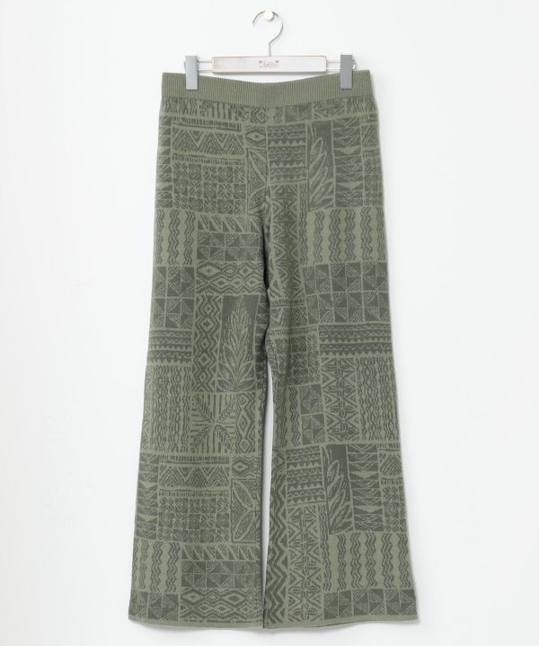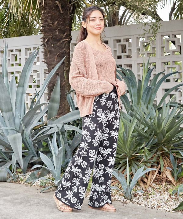 ゆったりと着られるニット素材のイージーパンツ。着心地の良さだけでなく、フレアなシルエットがスタイルアップにもつながります。それぞれの色味に合わせて描かれたハワイアン柄とともに、リラックスしたハワイアンタイムをお過ごしください。